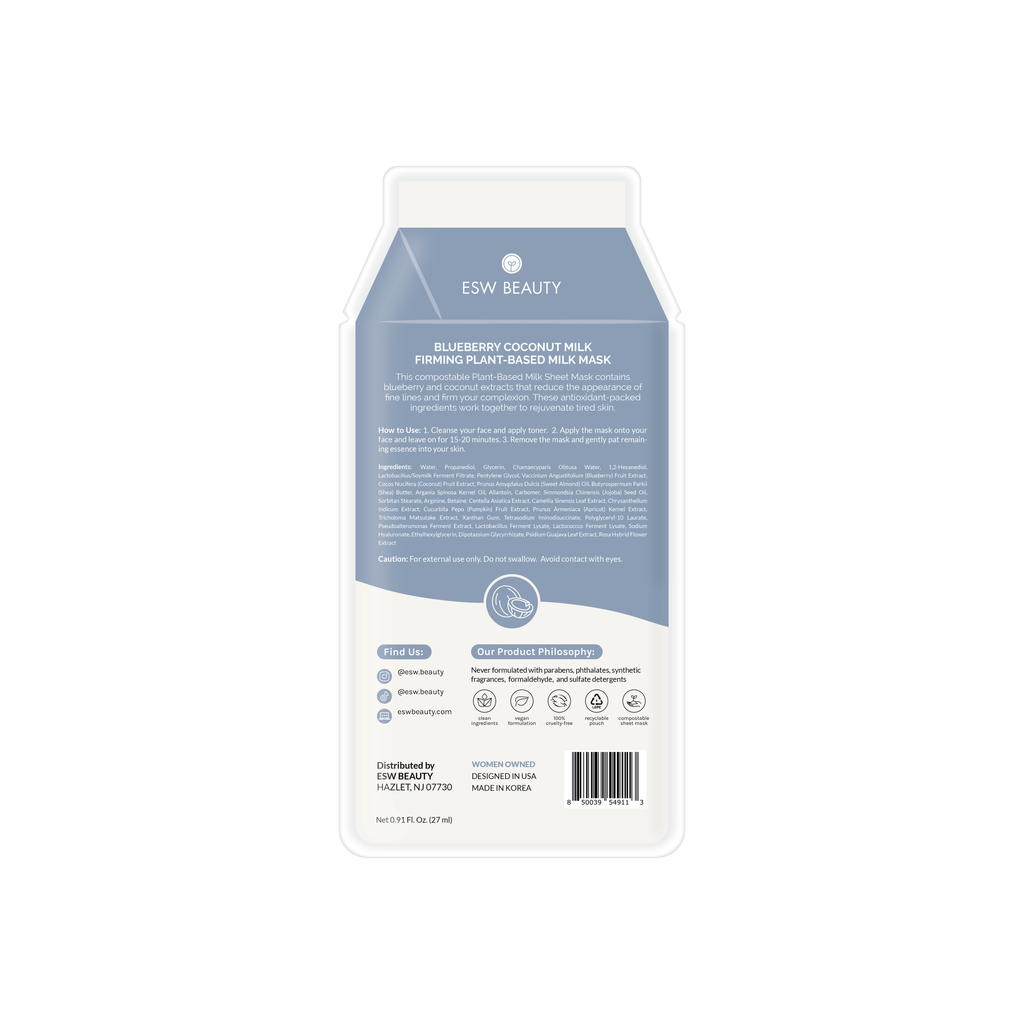 This sheet mask reduces the appearance of fine lines. This compostable Plant-Based Milk Sheet Mask contains blueberry and coconut extracts that reduce the appearance of fine lines and firm your complexion. These antioxidant-packed ingredients work together to rejuvenate tired skin.